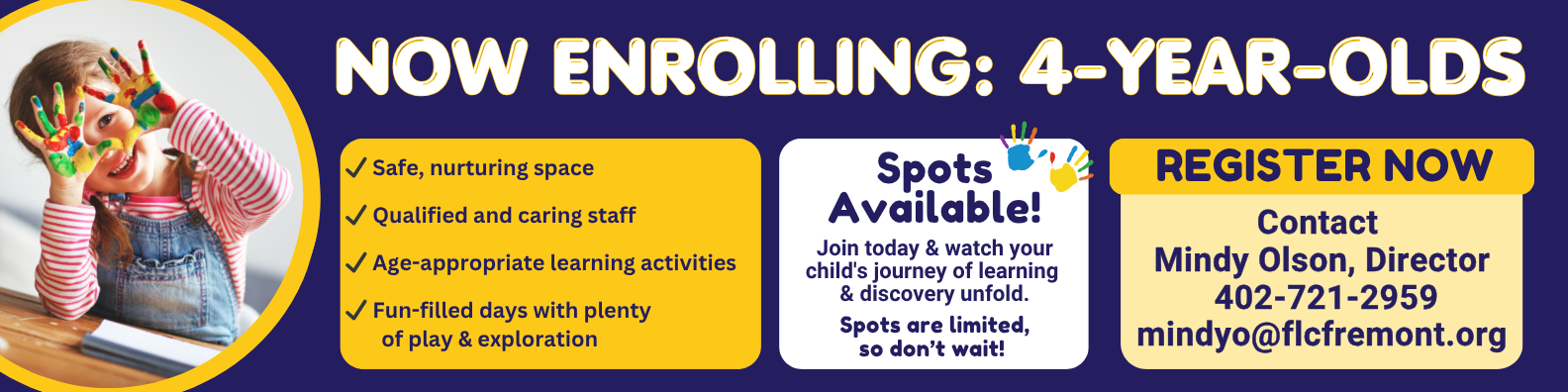 If this sounds appealing, we invite you to please call Mindy Olson at 402-721-2959 or email mindyo@flcfremont.org.